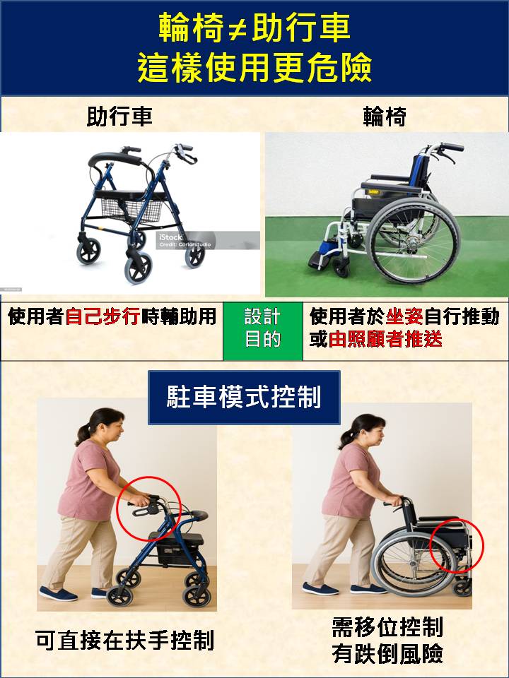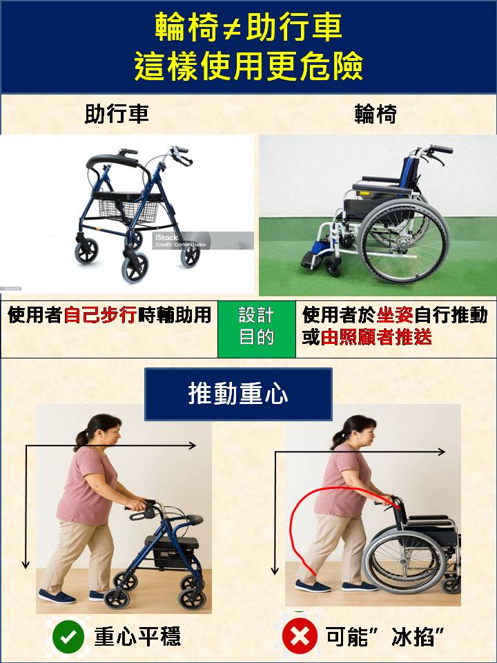 需要推車行走時,通常會有一個向前及向下的施力,而輪椅把手設計在四輪之後,且缺少手臂支撐的設計,過於用力時就會有翻車導致長輩跌倒的危險。而助行車具備手臂及輪管分散重心的設計,在推車的過程中可以提供足夠的穩定支撐。