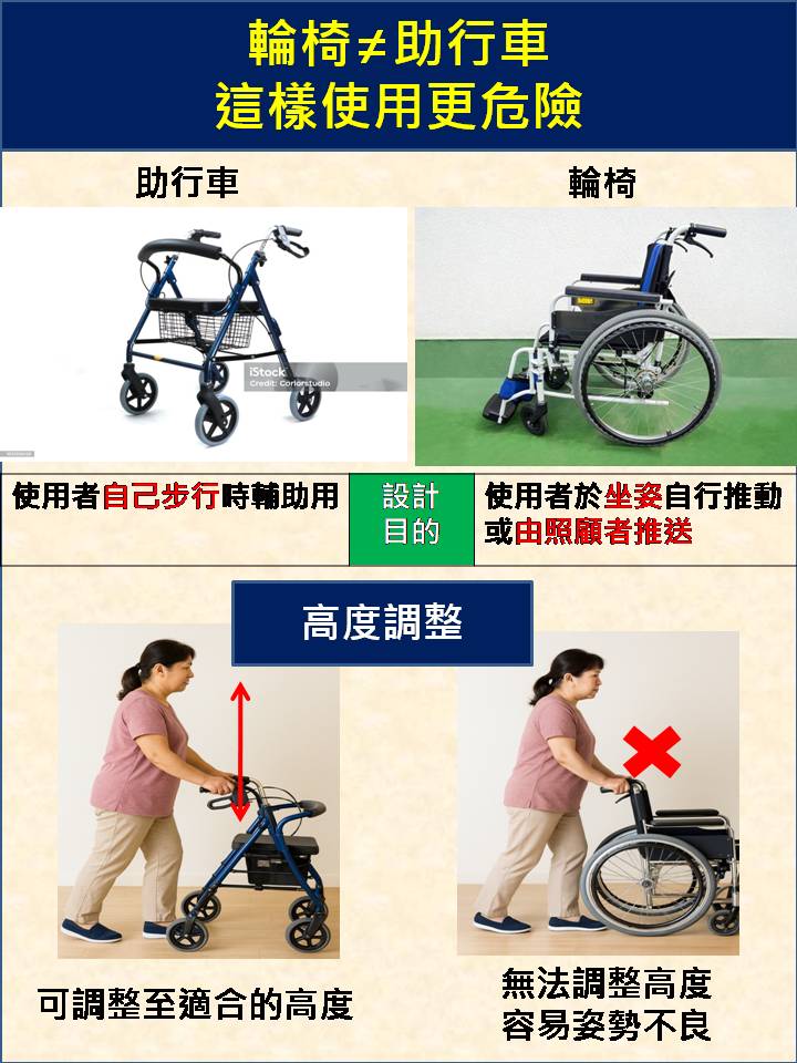 助行車的把手可調整高度來配合長輩的身高,輪椅則無法調整,可能必須以駝背的姿勢來推動,長期不良的姿勢反而容易導致腰痠背痛。