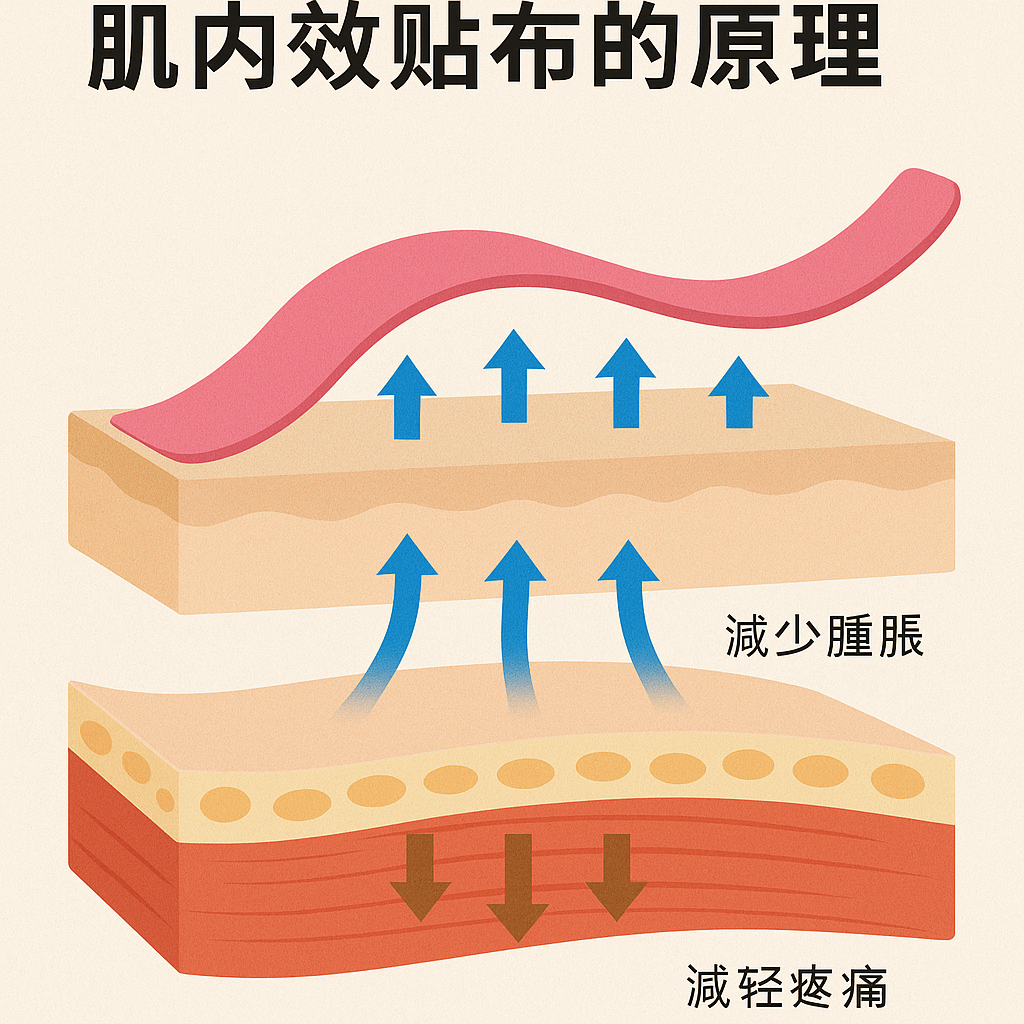 當貼布貼在皮膚上時,會產生一種回彈的牽引力,輕微地提起皮膚,創造出一個「微空間」,並刺激皮膚底下的感受器,進而影響肌肉、筋膜、淋巴和神經系統。另外,貼布拉伸時可儲存彈性能量,回彈方向若與肌肉收縮方向一致,能增強肌力;反之則能促進肌肉放鬆。