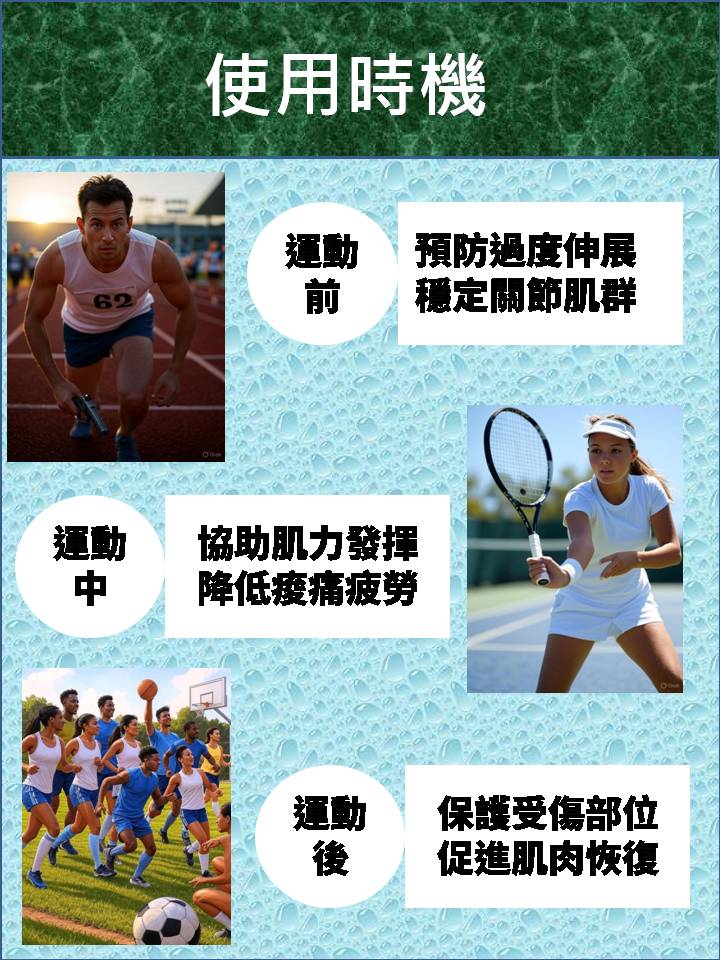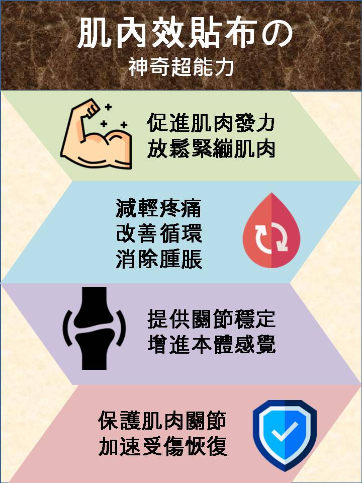 您是否曾看到運動員身上貼著五顏六色的貼布?或者自己也因為痠痛、運動傷害而想嘗試?這就是近年來超級夯的「肌內效貼布」!它並非痠痛藥布,主要由特殊的波浪紋路以及外層仿皮膚通氣布材的延展性組成,且只有貼布縱軸有彈性,隨著溫度提高有助於黏著。貼布本身並不具有藥物成分喔。