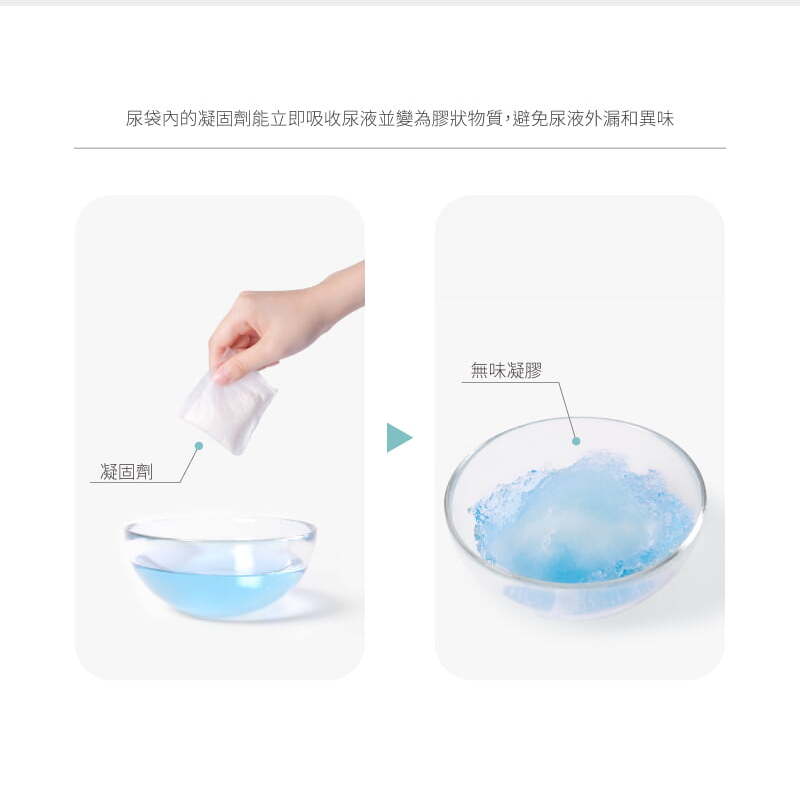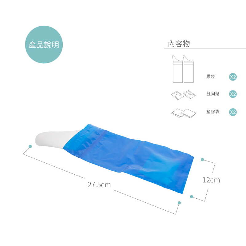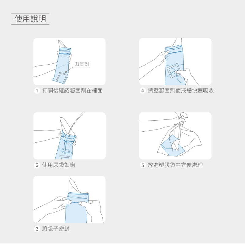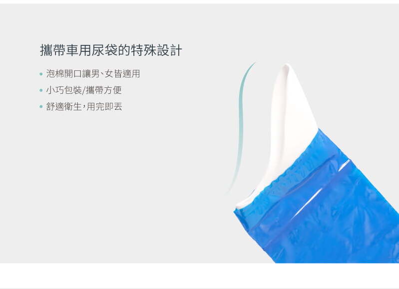 攜帶車用尿袋的特殊設計:泡棉開口讓男、女皆適用(女性請將泡棉突出之部份轉於下方)。袋內附有凝固劑將液體轉變為膠狀使用後請將夾鍊密封,再將尿袋丟入盒內所附之塑膠袋綁緊,即可丟棄。