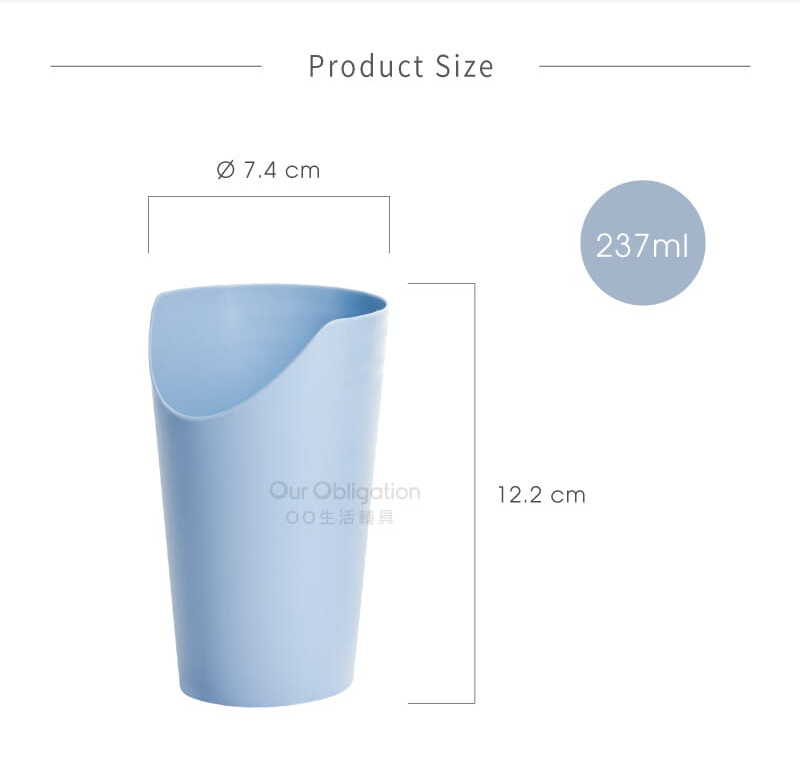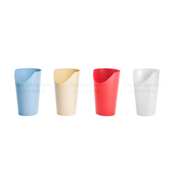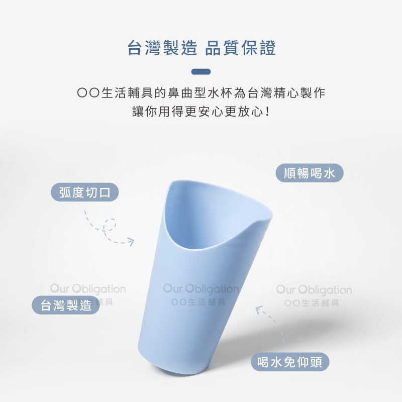 特殊的杯緣斜口設計,讓使用者不需抬頭或移動頸部,便可輕鬆將杯中的水喝光,減少二度傷害的機會