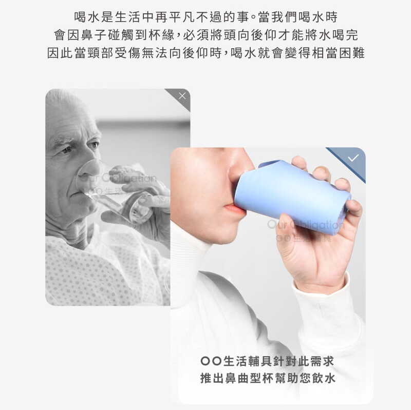 喝水是生活中再平凡不過的事你可能不會注意,當我們喝水時,會因鼻子碰觸到杯緣,必須將頭向後仰,才能將水喝完因此當頸部突然受傷無法向後仰時,喝水就會變成相當困擾的事