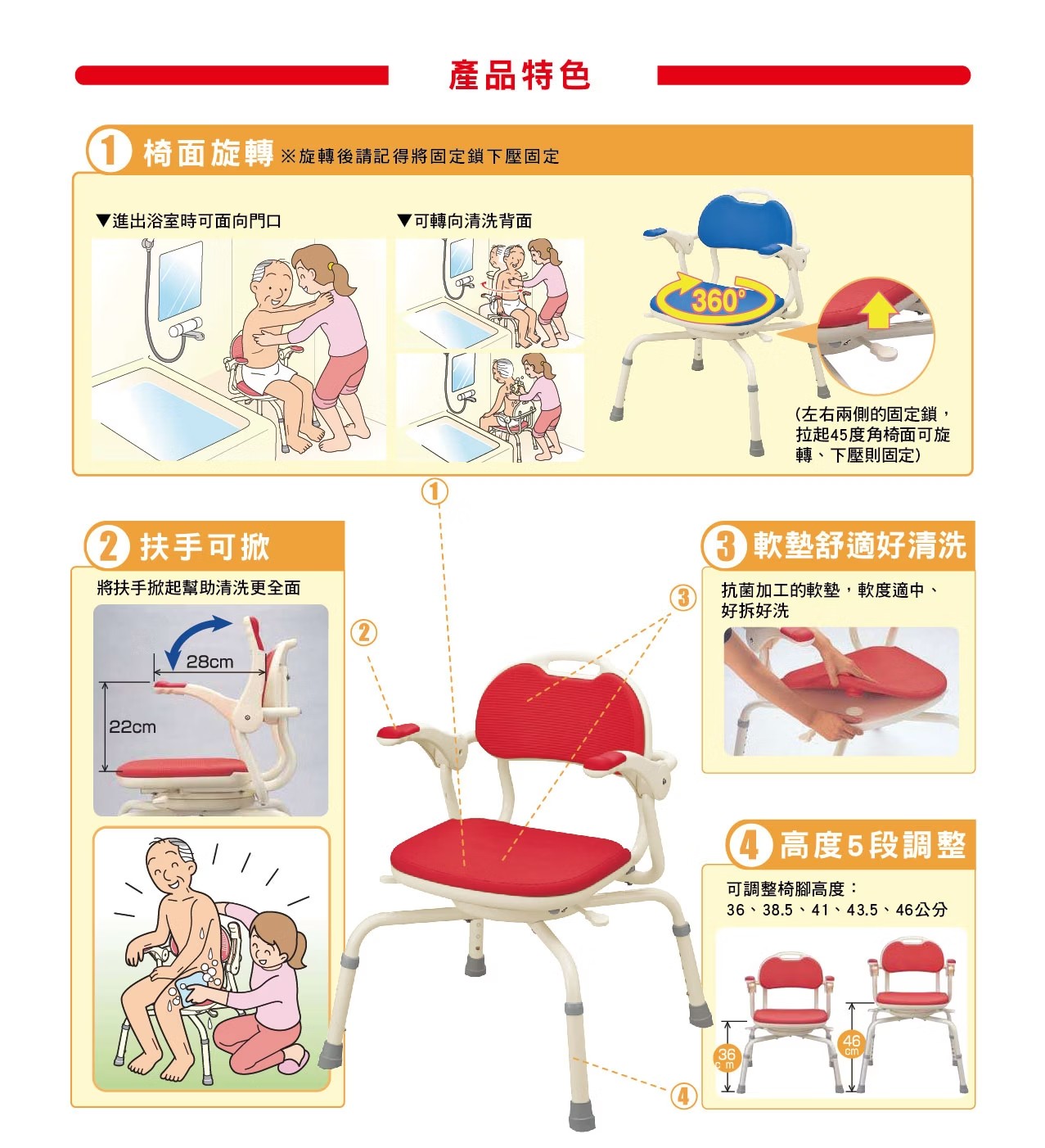座面可360度旋轉,方便移位與清洗身體各部位