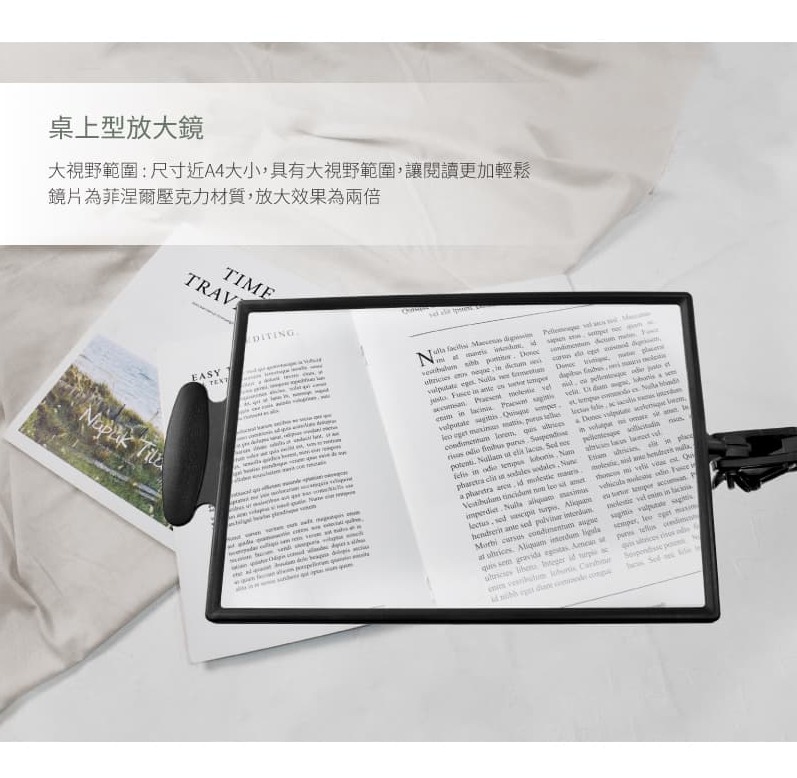 大視野範圍 : 尺寸近A4大小,具有大視野範圍,讓閱讀更加輕鬆。鏡片為菲涅爾壓克力材質,放大效果為兩倍