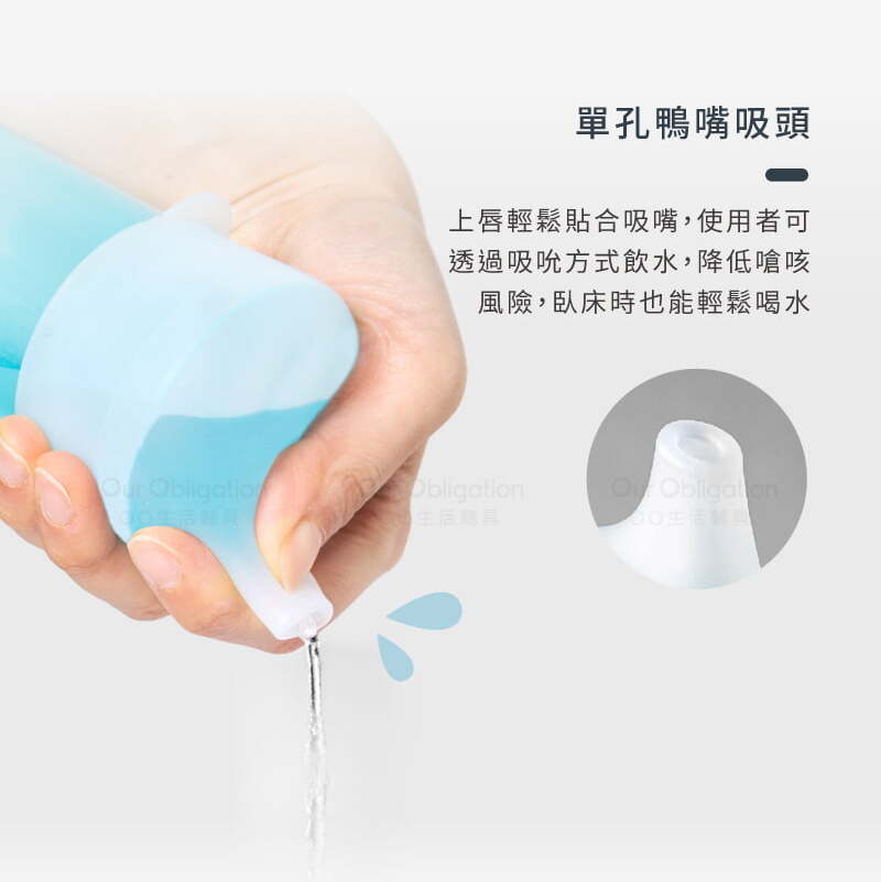 降低嗆咳風險: 單孔鴨嘴吸頭設計,使用者可透過溫和吸吮方式飲水,