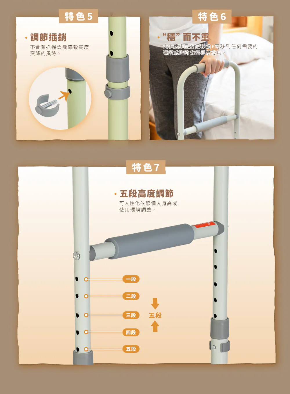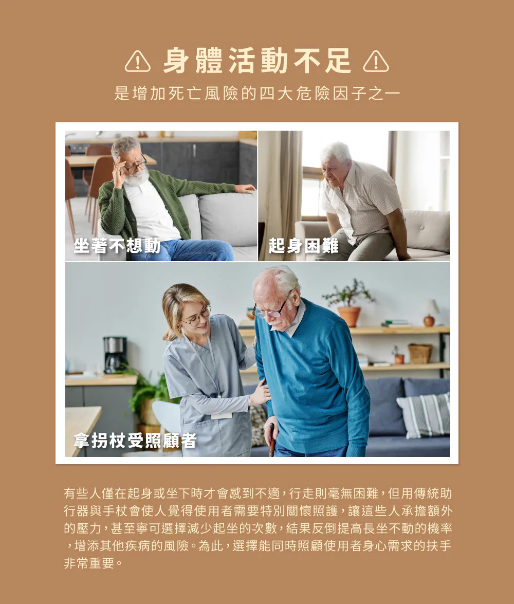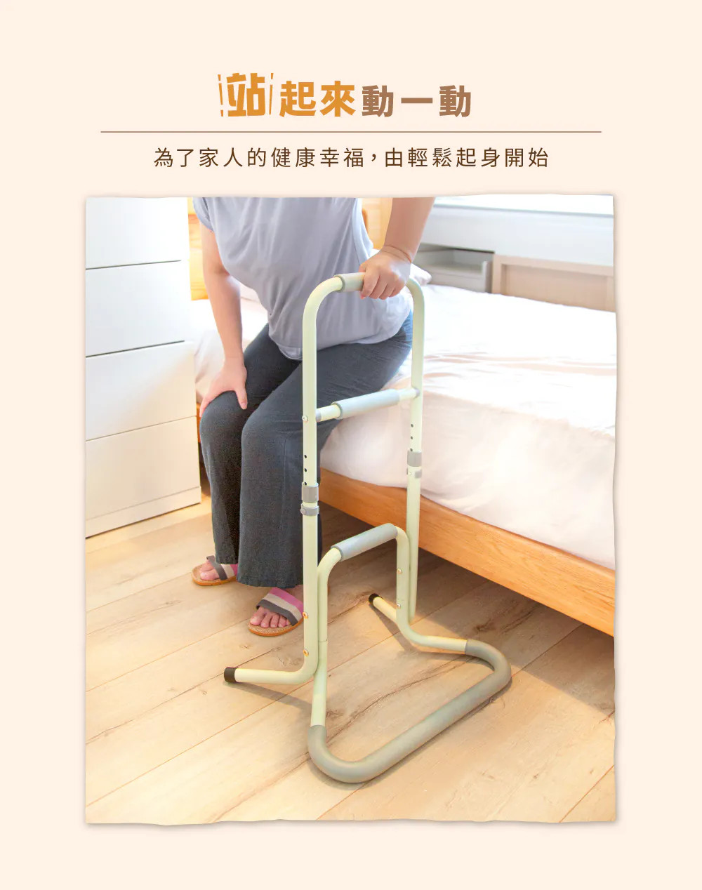安全且實用的設計,置放於沙發、床邊、玄關或廁所馬桶旁,讓起身或坐下時更安全、省力,是個居家必備的最佳輔助器具