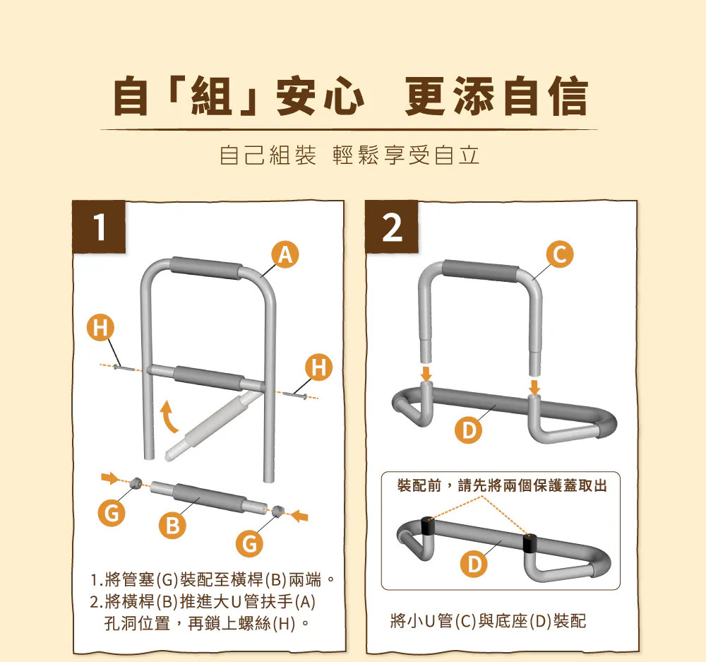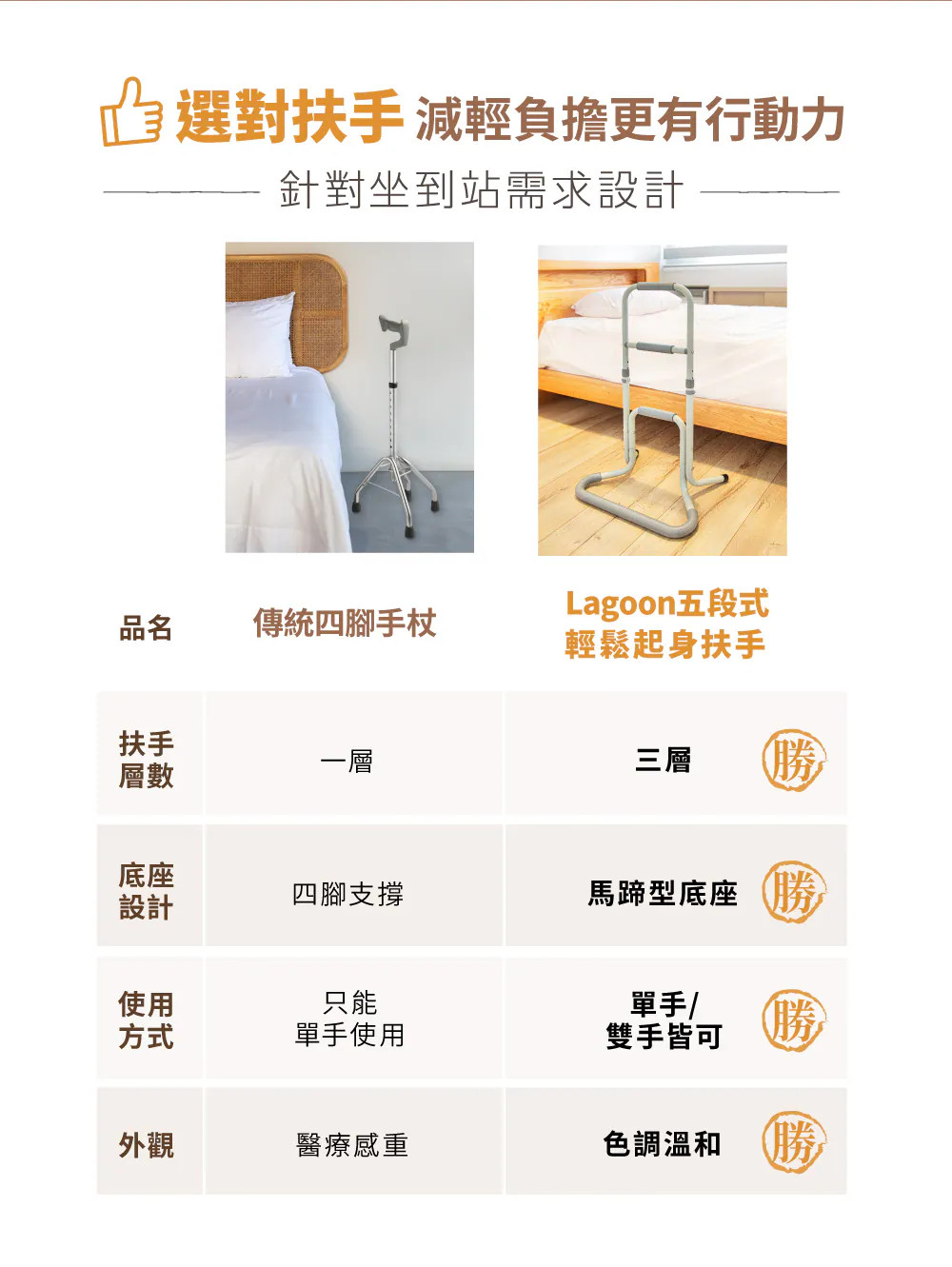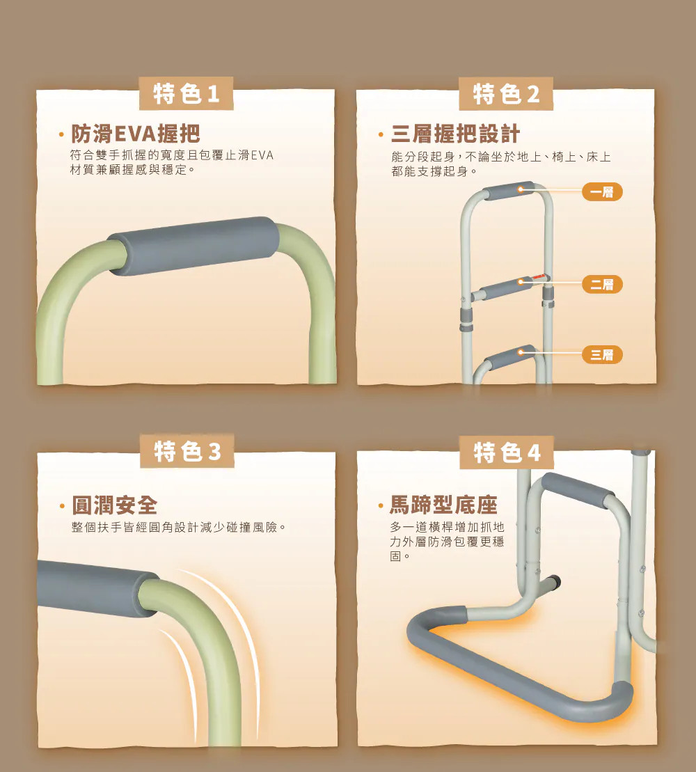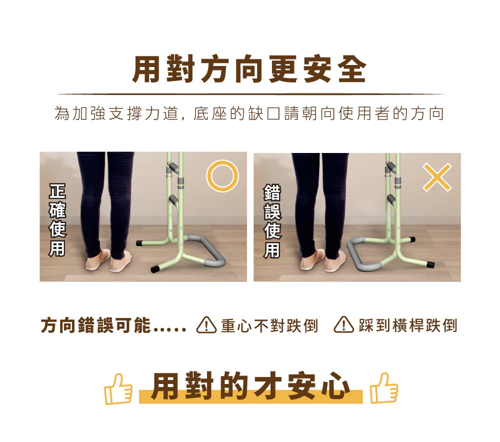 安全且實用的設計,置放於沙發、床邊、玄關或廁所馬桶旁,讓起身或坐下時更安全、省力,是個居家必備的最佳輔助器具